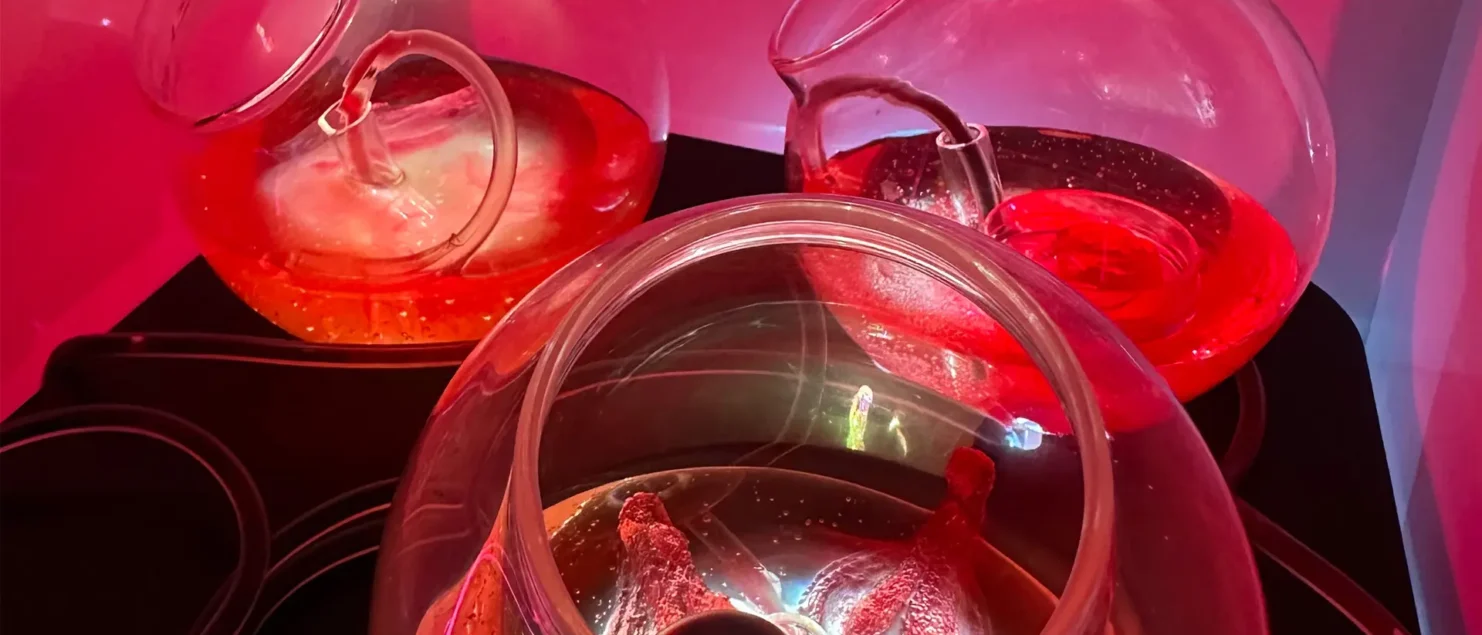 WhiteFeather Hunter, IMARA – Interstitial Machine for Aggregate Reparative Anatomies, 2025. 3D bioprinted in vitro clitorises, tubing with blood, glassware, LED light box.